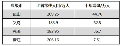 以已经步入大城市行列的昆山、义乌、慈溪、晋江来看,第七次人口普查数据显示,过去十年昆山、义乌、慈溪常住人口都增加了几十万,晋江也增加了7.51万人。