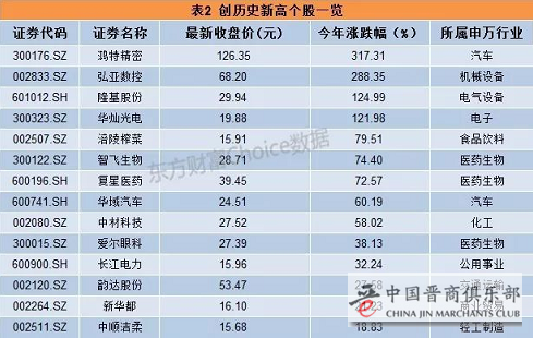 东方财富Choice数据显示,剔除今年上市的新股,华域汽车、复星医药、长江电力、中材科技、新华都、爱尔眼科、智飞生物、涪陵榨菜、中顺洁柔、鸿特精密、隆基股份、华灿光电、弘亚数控等在上周五盘中创历史新高。其中,不乏涪陵榨菜、复星医药等多只大消费股。