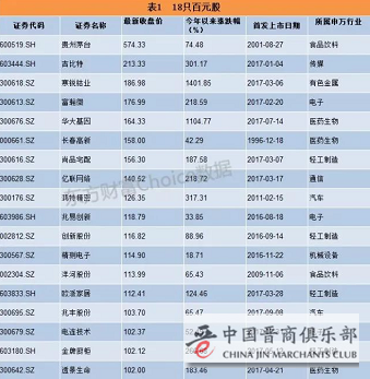18只百元股中,有14只百元股为2016年以来上市的次新股。另外4只百元股,分别为贵州茅台、长春高新、鸿特精密和洋河股份。其中贵州茅台、洋河股份为白酒股,长春高新属于生物医药行业,只有鸿特精密主营汽车零部件。