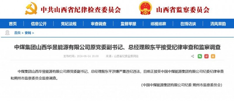 山西省纪委监委网站 14 日通报,中煤集团山西华昱能源有限公司原党委副书记、总经理殷东平涉嫌严重违纪违法,目前正接受中国中煤能源集团有限公司纪委纪律审查和朔州市监察委员会监察调查。