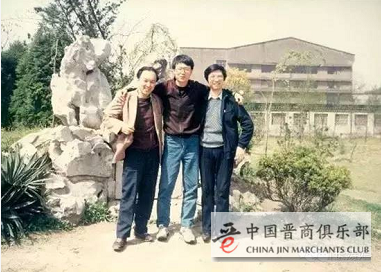 1988年,台湾新闻记者秦先生(中)在辩论赛不久后前前往上海拜访复旦队师生,与复旦队两位指导老师伍贻康(左)、王沪宁(右)在复旦校园里合影。