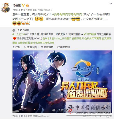当然,《一人之下》的潜力绝不仅止于“动画化”,其优质的内容也吸引到了各领域名人的关注。据了解,《一人之下》的动画顾问便是由才女徐静蕾所担任的,而在《一人之下》第一季开播的时候,徐静蕾还在微博中透露“同名电影剧本准备中”,引起粉丝们的强烈期待。知名作家马伯庸也是《一人之下》的忠实粉丝,在微博上同徐静蕾及动画官博进行互动。