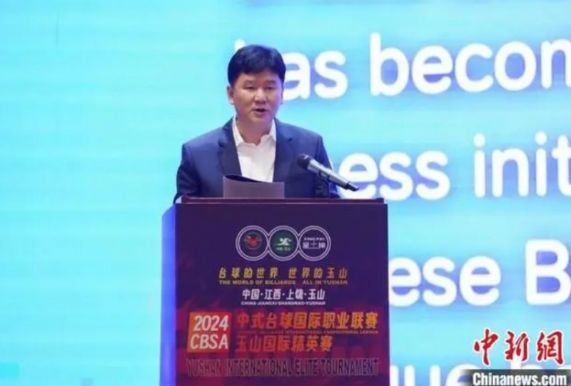 中国台球协会主席助理兼代理秘书长秦吉宏在2024CBSA中式台球国际职业联赛国际精英赛开幕式上致辞。星牌体育供图