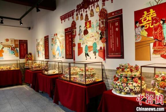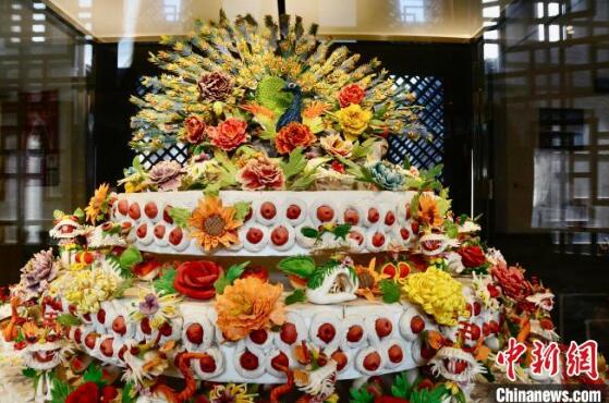 中新网太原6月25日电 (杨杰英 杨润德 梁月仙)吉祥喜庆的寿桃、活灵活现的飞龙、绚丽缤纷的玫瑰……走进太原古县城一家花馍店铺内,透明的玻璃柜内陈列着各式各样的花馍,造型多样、内涵丰富、色彩艳丽。