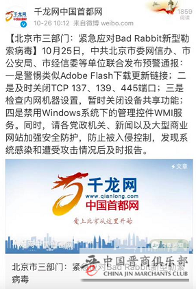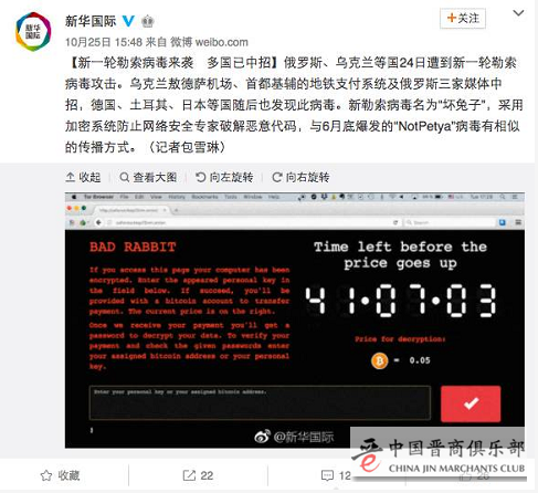 新勒索病毒名为“坏兔子”,采用加密系统防止网络安全专家破解恶意代码,与6月底爆发的“NotPetya”病毒有相似的传播方式。