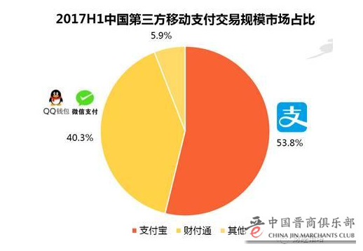 事实上,近年来腾讯通过“微信支付”,成功瓜分了支付宝垄断的第三方支付市场。根据“艾媒咨询”的数据(见下图),到今年上半年,腾讯旗下“财付通”的份额已经超过40%,支付宝的市场份额为53.8%。