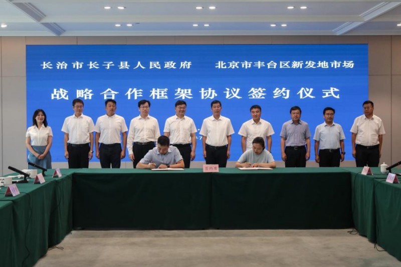 7月4日,长子县与北京市丰台区新发地农产品批发市场在长治滨湖文旅服务中心潞安厅举行战略合作框架协议签约仪式。市委副书记、市长陈向阳,北京市丰台区区委副书记、区长初军威出席。县委书记郭强,县委副书记、统战部部长王慧忠,县委常委、常务副县长王燕,县委常委、副县长蔺际武参加。