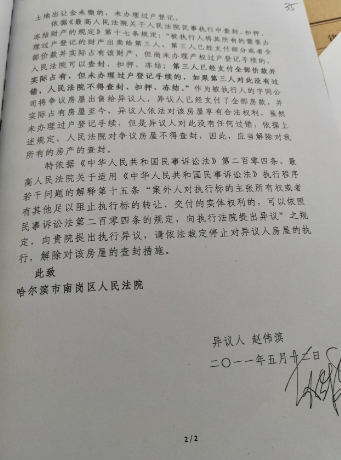 就在2024年5月16日,南岗区人民法院对赵伟滨提出的执行异议下发了执行裁定书。