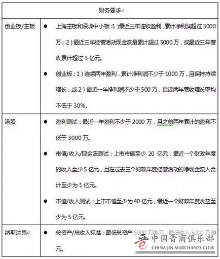 不同的资本市场,对于企业的进入都有一定的财务要求(如下表),将这些财务要求作为企业阶段性的业绩目标,不失为一个简单的方法,用这个目标来勉励团队同心协力、使命必达。迅速将企业的规模上升到一个新的平台。