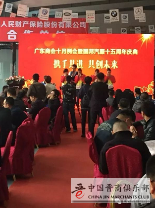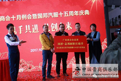 2017年10月28日,山西省广东商会(中国晋商俱乐部联合发起机构)十月例会暨国邦汽服十五周年庆典,在商会副会长陈国军单位国邦汽服成功举办。会长曾建新,常务副会长池飞广、黄仁才、郭汉柳、蔡懿壮、杨勇民,副会长朱文河、张明流、高阳光、傅志刚、宋庆华、刘志东和姚舜玲等理事、会员参会并参与庆典。
