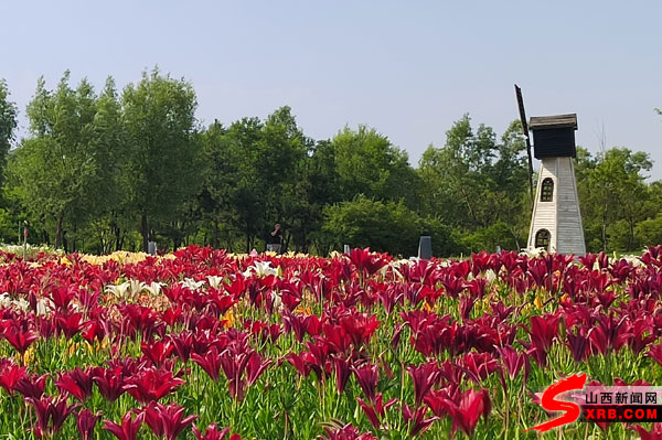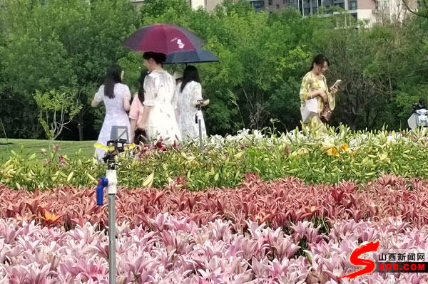 缤纷夏日,漫步于太原市晋阳湖东岸,一股沁人心脾的芳香在傍晚的微风中弥漫开来,觅香而去,园区内一片五彩斑斓的花带中,各色各样的百合花热烈绽放,引得游客驻足观赏。