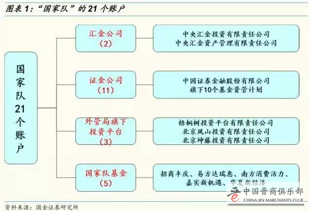 “国家队”包括汇金公司、证金公司、外管局旗下3个投资平台以及5支“国家队”基金,共有21个账户。如图: