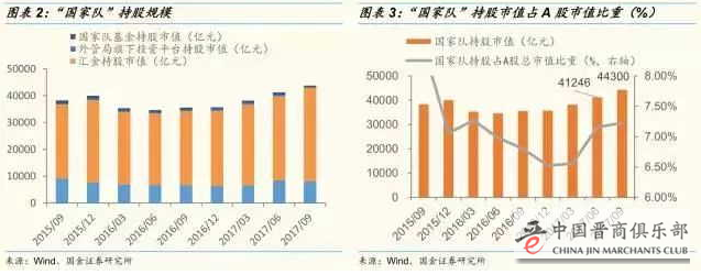 截止2017Q3,“国家队”持股市值达4.43万亿,创历史新高。“国家队”的21个账户共持有1128只个股,持股市值合计达4.43万亿元(过去四个季度分别是:4.12万亿、3.82万亿、3.57万亿、3.55万亿),占A股总市值的7.23%(过去四个季度分别:7.16%、6.56%、6.53%、6.80%)。“国家队”体量之大,是A股不可忽略的特殊力量。