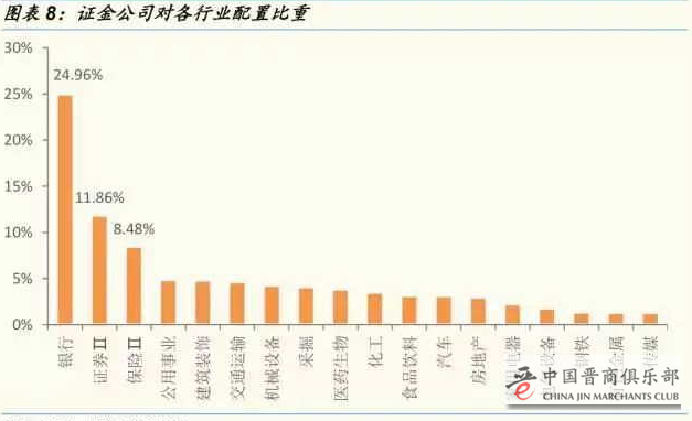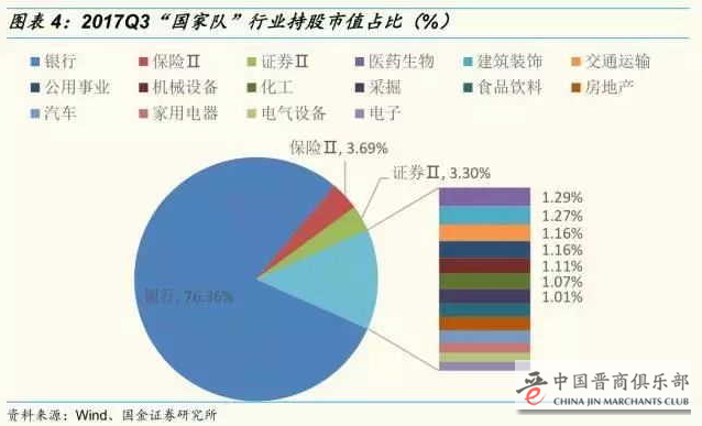 行业配置比例来看,“国家队”持股主要集中在大金融行业,其中对银行持股市值占比最大,保险和券商次之,比重分别为76.36%、3.69%、3.30%。