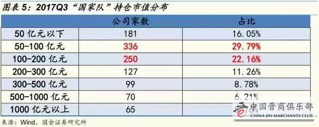 “国家队”持股公司的市值分布主要集中在“50-100 亿、100-200 亿”。