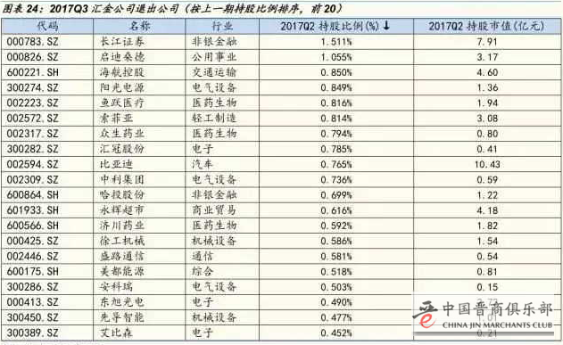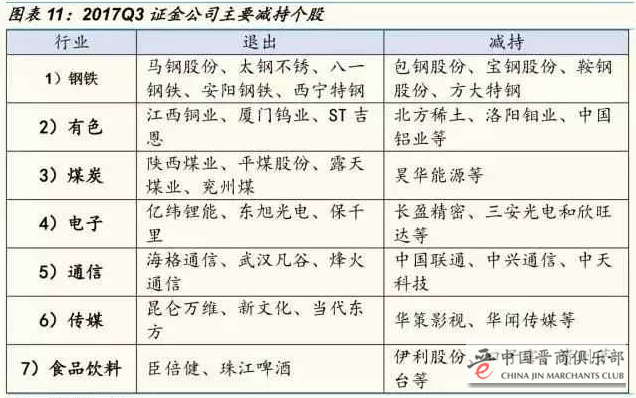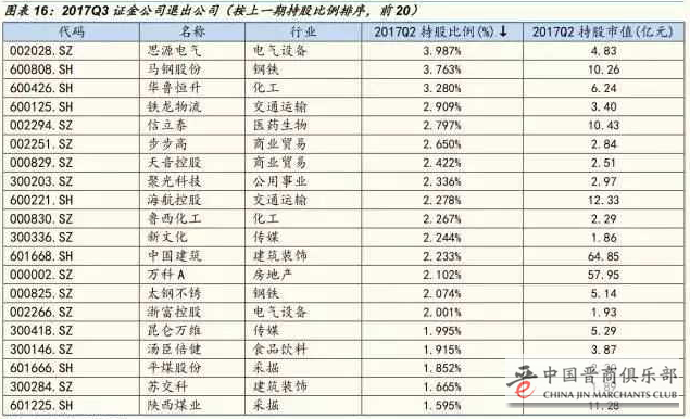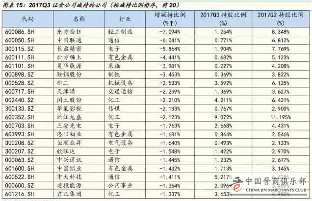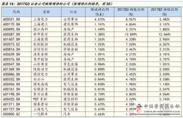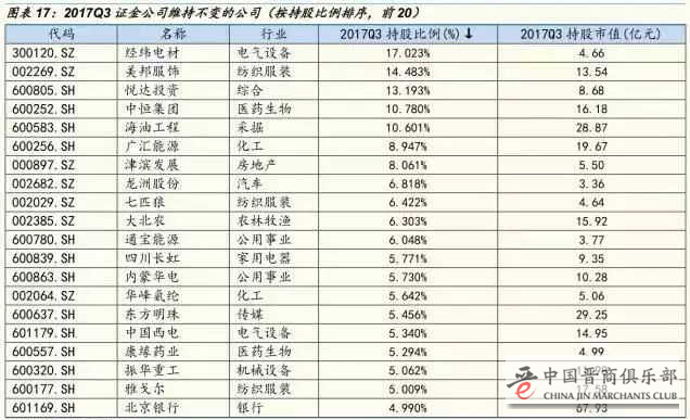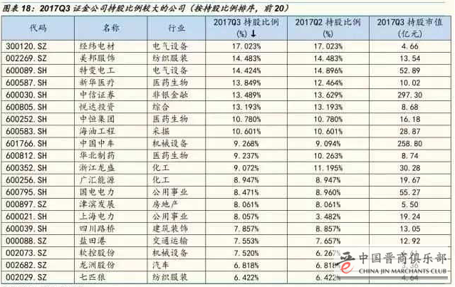 经过“增减持”之后,2017Q3证金公司持股比例较大的公司有: