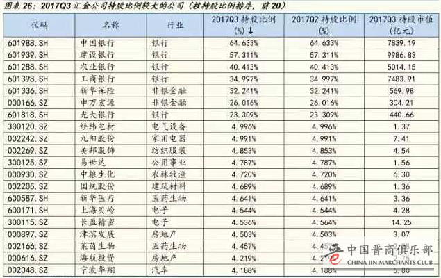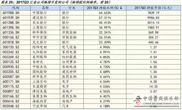 由此,经过“增减持”之后,2017Q3汇金公司持股比例较大的公司有: