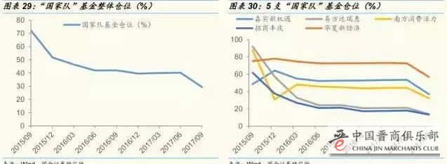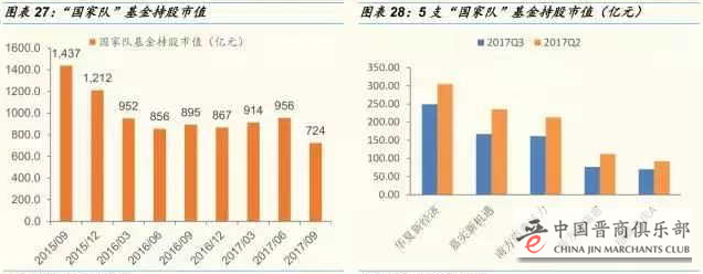 三季度末,5支“国家队”基金规模仓位均创新低:规模为724.2亿元股票市值(前值为956.4亿元),整体仓位为29.35%(2016年以来平均仓位为41.7%)。