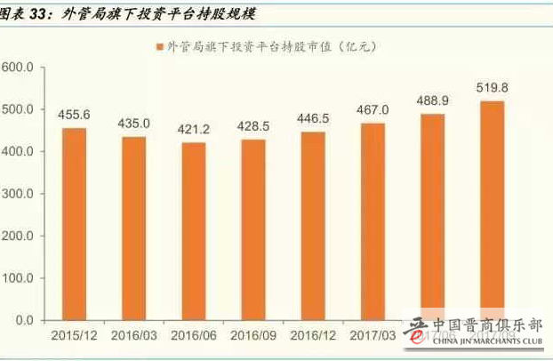 外管局旗下投资平台于2015四季度首次出现在上市公司是大股东之列,但持股规模相对较小。截止2017年三季度末,外管局旗下投资平台的3个账户合计持有18家公司,持股市值达519.8亿元。