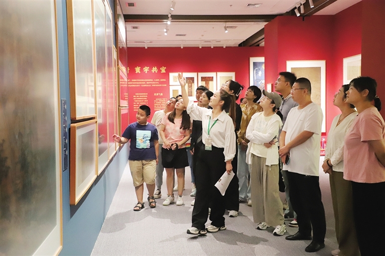 观展的队伍里,二刷、三刷者不少。他们有的凑近画作细细观察,有的围在画作下听其中的故事,更有甚者凝视画作许久,犹如置身画中。“大开眼界”“家门口一定要看的展览”“一场穿越时空的震撼之旅”……现场观众的褒奖不绝于耳,涌动着对中华传统文化的兴趣与热爱。