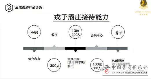 会上介绍了戎子酒庄的旅游接待能力,预计2019年古风小院建筑群落与会展中心的建成将扩大接待能力,无论是住宿还是餐饮方面,其余休闲娱乐配套设施的建设也将提高消费者的旅游质量。