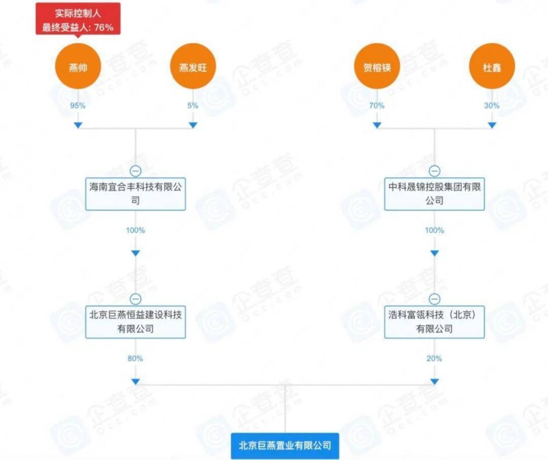 在拿地前夕的8月,巨燕置业的股东发生了大洗牌,燕发旺将全部股份转让予北京巨燕恒益建设科技有限公司(简称“巨燕恒益”)。穿透可知,巨燕恒益由海南宜合丰科技有限公司全资持股,而宜合丰科技又由燕帅和燕发旺分别持股95%和5%。燕帅是燕发旺的儿子。