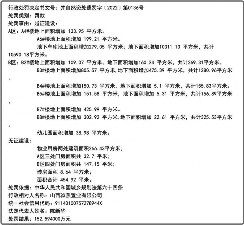 燕发旺名下有多家地产公司。例如,他全资持股了山西骅燕置业有限公司(简称“骅燕置业”)。2022年10月,骅燕置业所开发的康馨苑住宅小区项目A区A4#楼、A6#楼、地下车库,B区B2#楼、B7#楼、B8#楼、幼儿园及物业用房、门房、砖房,因无证、越证被罚1525938.93元。