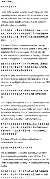 与此同时,另一封《新飞发向全体员工的一封信》在网上流传:新飞董事会表示公司在激烈的竞争中盈利越来越困难,无奈闭厂停产!↓