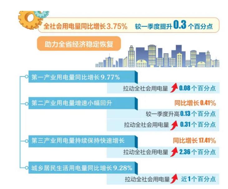行业和居民用电量平稳增长。第一产业用电量同比增长9.77%,拉动全社会用电量增长0.08个百分点;第二产业用电量增速小幅回升,同比增长0.41%,较一季度升高0.13个百分点,拉动全社会用电量增长0.31个百分点;第三产业用电量持续保持快速增长,同比增长17.41%,拉动全社会用电量增长2.36个百分点;城乡居民生活用电量同比增长9.28%,拉动全社会用电量增长近1个百分点。