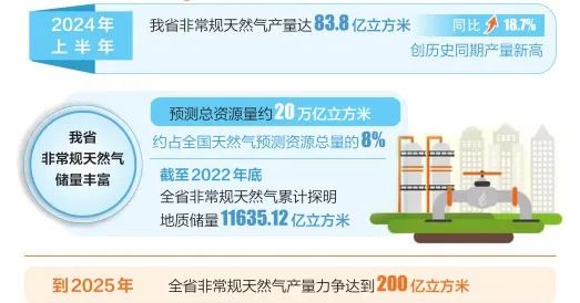 非常规天然气基地建设一直是山西省推动能源产业绿色转型的重要抓手之一。近日,省统计局传来消息,2024年上半年,山西省非常规天然气产量达83.8亿立方米,同比增长18.7%,创历史同期产量新高。