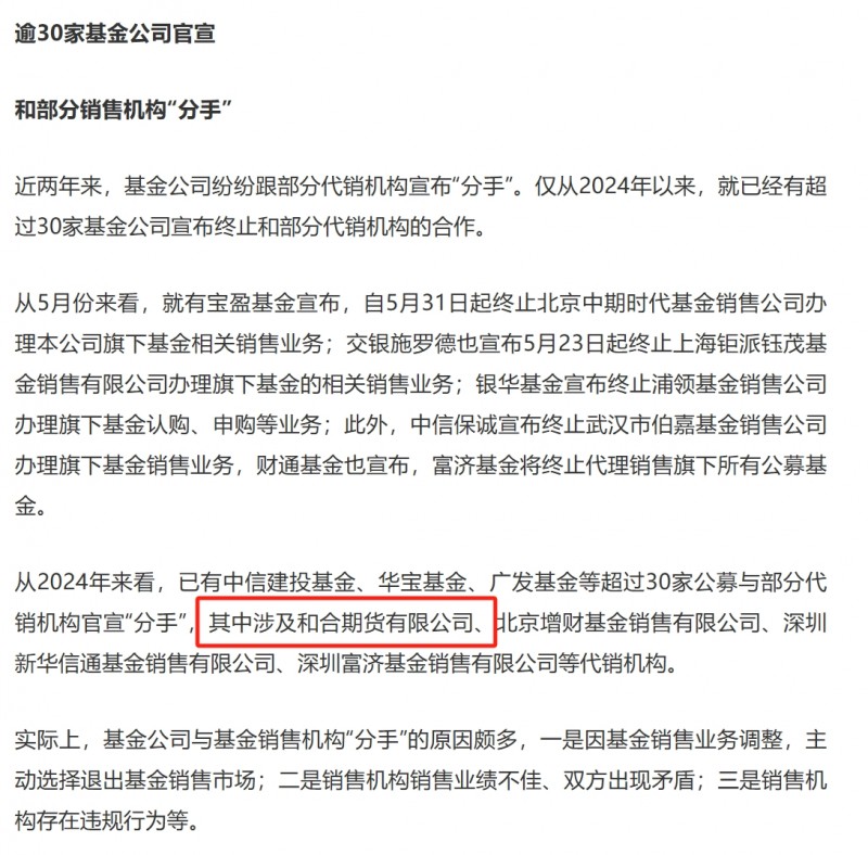 在2024年逾30家基金公司官宣和部分销售机构“分手”,其中涉及和合期货有限公司。