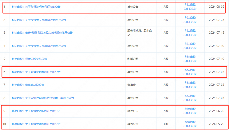截至8月9日,山西科达自控股份有限公司先后9次发布关于取得发明专利证书的公告,共涉及专利13项,其中7月份至今共有3项发明收到了国家知识产权局颁发的 《发明专利证书》,知识产权保护体系进一步被完善。