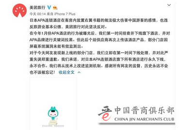美团旅游方面则表示,今年1月份APA酒店的行为被曝光后,就排查并下线旗下酒店,并对APA品牌进行关键词拉黑,但此后个别供应商再次上传该酒店产品,部分门店因屏蔽系统漏洞未能有效监测出。对于网友发现新上线的部分门店,美团旅游已下线处理,并对此严重失误郑重道歉,同时表示对日本APA连锁酒店旗下所有酒店进行永久下线,永不合作。
