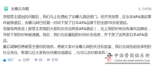 13日16时许,在“王瑞扬”的知乎回答下方评论区内,去哪儿网驻知乎官方账号“去哪儿攻略”作出回应说,“发现答主提出的问题后,我们马上反馈给去哪儿酒店部门。现在,我们也在最短的时间补全信息,并下架了这两家日本APA酒店”。