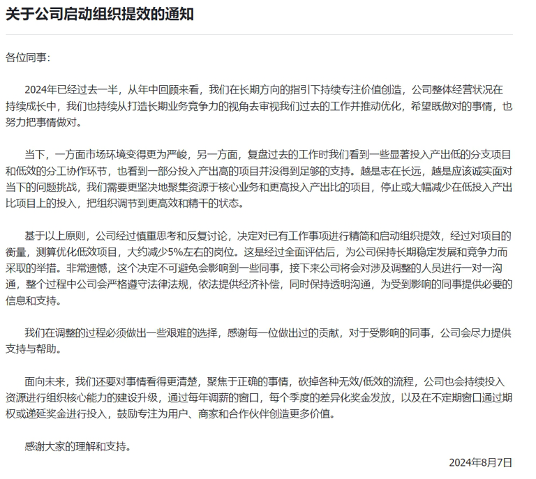 内部信中透露,公司整体经营状况在持续成长中。综合考虑后,决定对已有工作事项进行精简和启动组织提效,经过对项目的衡量,测算优化低效项目,大约减少5%的岗位。针对此次受影响员工的解决方案,全员信称“将进行一对一沟通,提供经济补偿”。