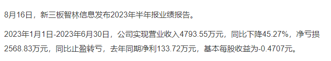 在2023年8月16日,新三板智林信息发布2023年半年报业绩报告,该公司也是属于净亏损的状态,在发完报告之后,智林信息技术股份有限公司全资子公司再次进行贷款担保。