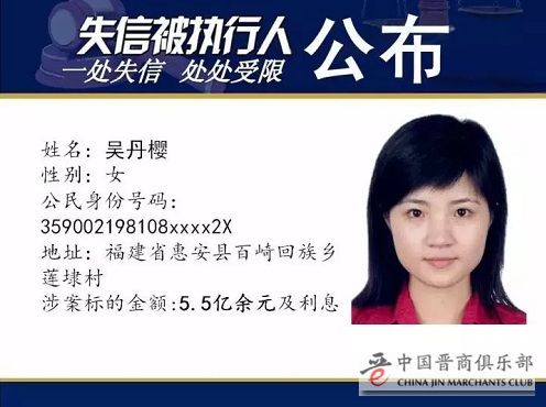 11月7日,福建泉州中院在其微信公众号上公布了一份“老赖”名单,其中,一个名为吴丹樱的“80后”女孩竟然欠下5.5亿元巨款。