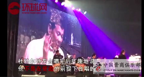 1、在晚宴上,东道主杜特尔特玩得很嗨,他出人意料站到前台,和菲律宾流行歌曲女歌手Pilita Corales一起,合唱了菲律宾情歌《Ikaw》(你)。