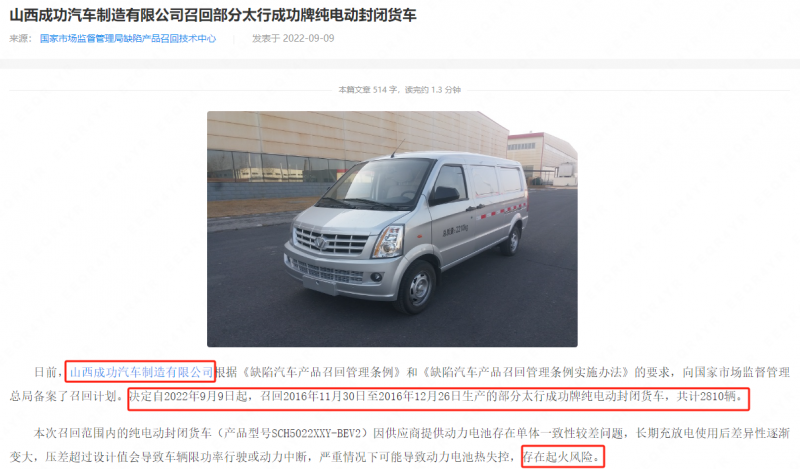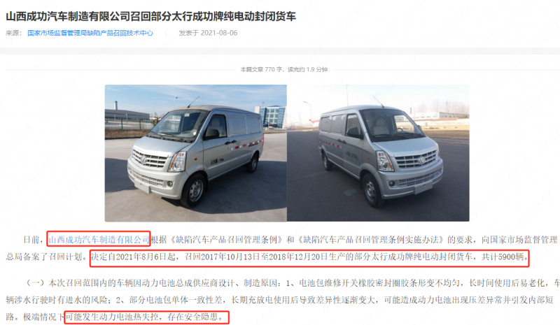 2021年8月,山西成功汽车制造有限公司根据《缺陷汽车产品召回管理条例》和《缺陷汽车产品召回管理条例实施办法》的要求,向国家市场监督管理总局备案了召回计划。决定自2021年8月6日起,召回2017年10月13日至2018年12月20日生产的部分太行成功牌纯电动封闭货车,共计5900辆。