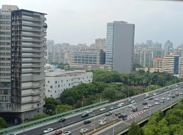 正对面隔着高架桥,一座刚翻新的漕溪公园,绿化环境非常治愈