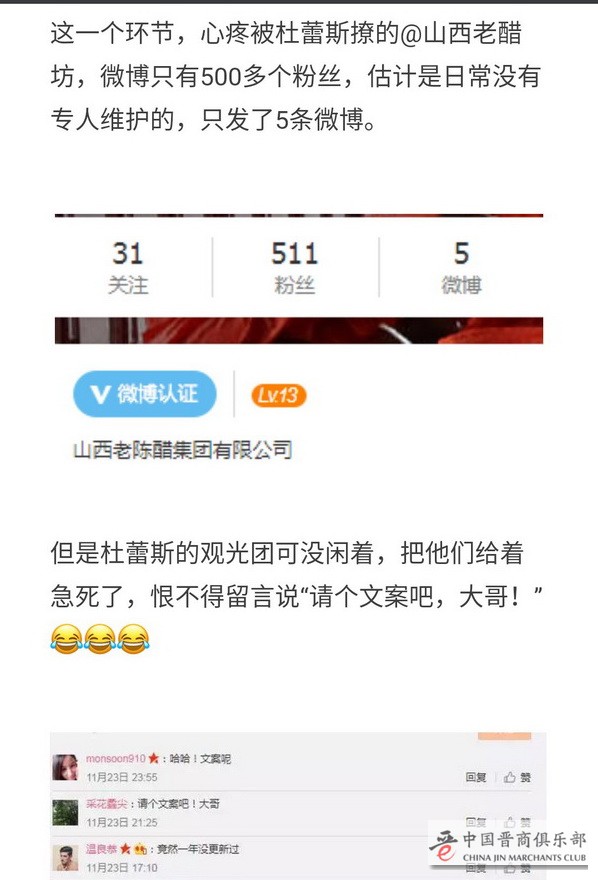 山西老醋坊据悉是山西老陈醋集团的官方帐号,在这次激情恩爱中,唯独老陈醋“痿”了。