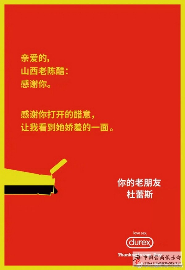 杜蕾斯那可是不得了的大BOSS啊,它守护人类文明的大门,这样的BOSS在这次激情恩爱中,山西品牌中只有“老陈醋”被它看上了,可是老陈醋却痿了。