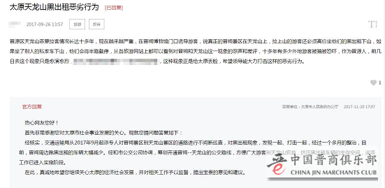 晋源区天龙山恶意拉客情况长达十多年,现在越来越严重,在晋祠博物馆门口诱导游客,说真正的晋祠景区在天龙山上,拉上山的游客还必须高价坐他们的黑出租下山,如果坐了别人的私家车下山,他们会将半路截停,从各旅游网站上都可以看到对晋祠和天龙山这一现象的怨声和差评,十多年有多少外地游客被骗被恐吓,作为晋源人,前几日去这个现象只是愈演愈烈。这种现象正是给太原丢脸,希望领导能大力打击这样的恶劣行为。