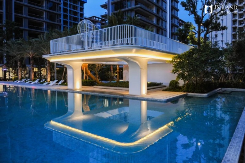 穿过大堂区进入园区,呈现在眼前是该项目中央景观区,开阔的视野,南北楼间距差不多一个标准足球场的大小。跌水瀑布和中央休闲泳池,成人、儿童分区的人性化设计,游泳健身和游玩童趣互不干扰。