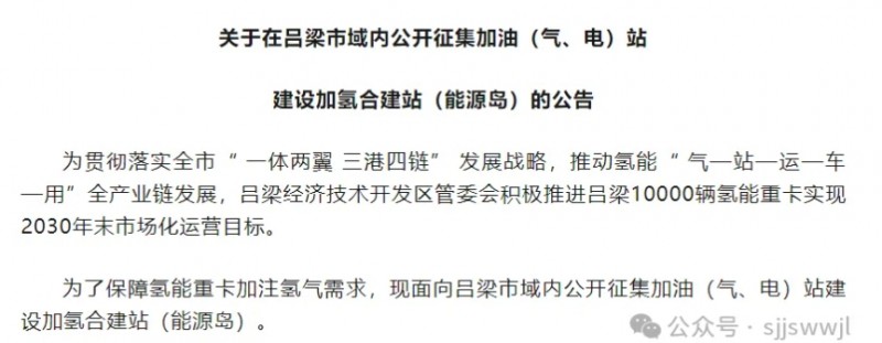 9月24日,吕梁经开区管委会发布关于在吕梁市域内公开征集加油(气、电)站建设加氢合建站(能源岛)的公告。告指出,为贯彻落实全市“ 一体两翼 三港四链” 发展战略,推动氢能“ 气—站—运—车—用”全产业链发展,吕梁经济技术开发区管委会积极推进吕梁10000辆氢能重卡实现2030年末市场化运营目标。为了保障氢能重卡加注氢气需求,现面向吕梁市域内公开征集加油(气、电)站建设加氢合建站(能源岛)。