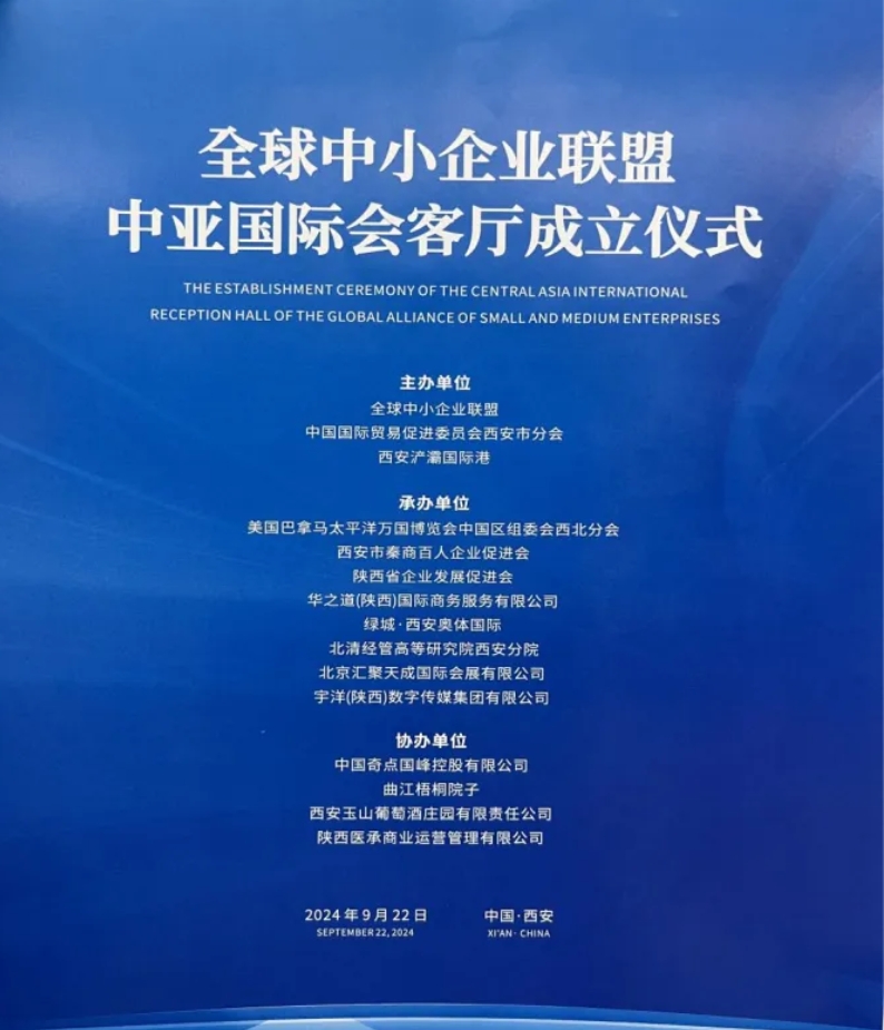 9月22日下午,全国瞩目的2024“絲博会"在西安隆重召开之际,由西安市贸促会与全球中小企业联盟共同主办的全球中小企业联盟中亚国际会客厅成立仪式在西安成功举办!