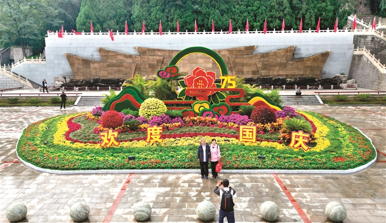 核心提示:设置在阳泉市南山公园北广场的大型立体花坛以庆祝中华人民共和国成立75周年为主题,以寓意团圆美满的圆环配以牡丹花和祥云、青山