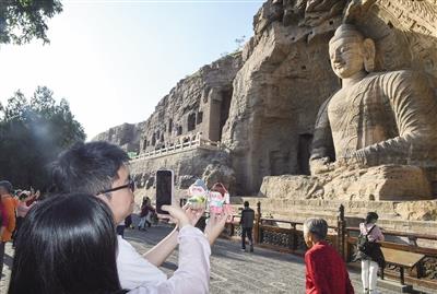 核心提示:9月25日,两名游客手托文创产品佛小伴玩偶与云冈大佛合影留念。今年大同旅游热度不断攀升,大同文创产品同样火爆。每一件产品都