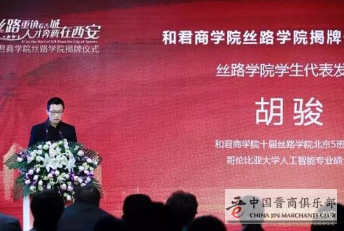 在此次揭牌仪式中,和君商学院十届丝路学院学生、哥伦比亚大学人工智能专业硕士毕业生胡骏,更是以其在美国脸书、微软等著名企业工作,以及在硅谷及回国后的创业经历,向青年人发出了“虽有智慧,不如乘势”的号召,鼓励向他一样从海外回国的名校青年,抓住机会,踏实奋斗。