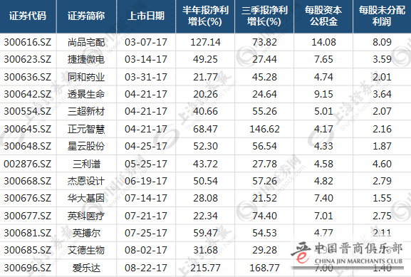 剔除今年以来披露过送转方案个股后,在余下的185只中小创次新股中,再以每股资本公积金大于4元、每股未分配利润大于1元、半年报净利增长超过20%、三季报净利增长超过20%为条件进行进一步筛选,最终有14只个股脱颖而出(见下表)。或许,这14只中小创次新股后市高送转概率较高,宜逢低布局坐等利好兑现,抢权行情值得期待。